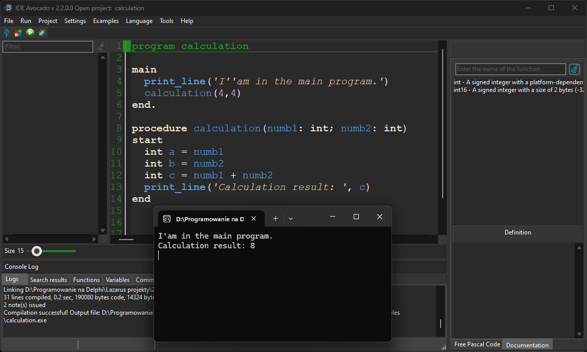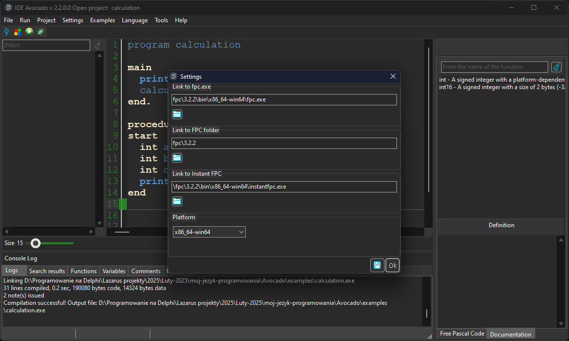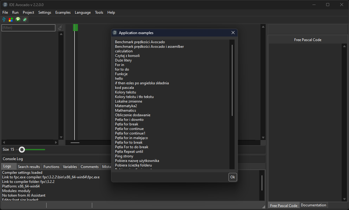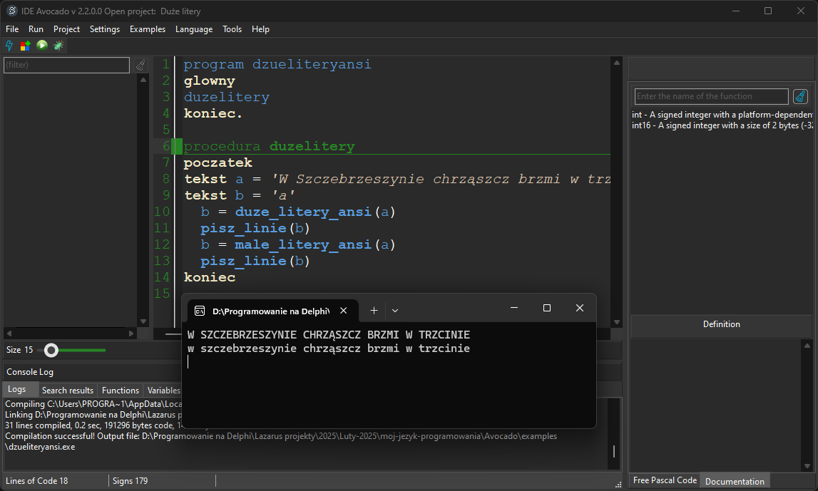A unique feature of this language is the ability to write commands in Polish and English compile code to .exe format. The language is available free of charge for commercial and non-commercial projects. The source code for Avocado is available under the MIT licence on GitHub.